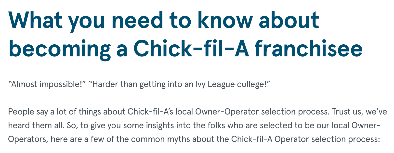 If you think getting into Harvard is hard, try becoming a Chick-fil-A franchisee. With an acceptance rate of less than 1%, it's statistically harder to get a Chick-fil-A franchise than admission to Harvard. A point that Chick-fil-A has tacitly acknowledged: